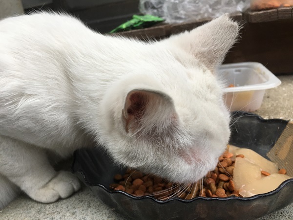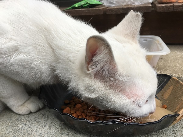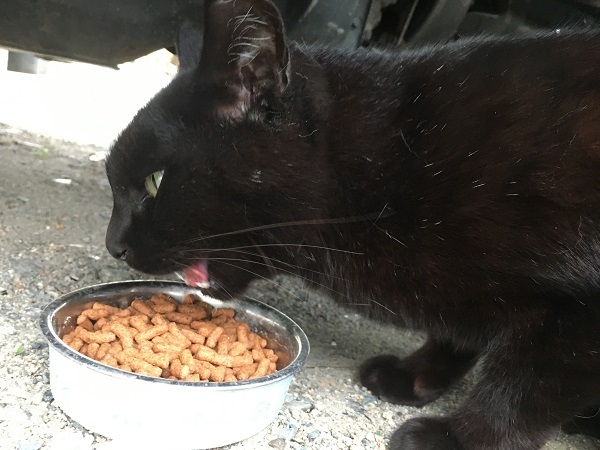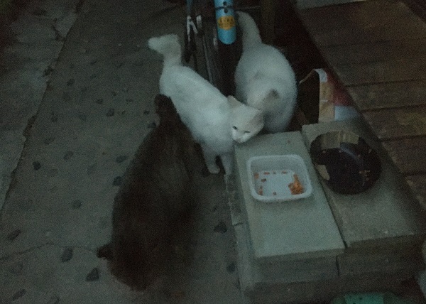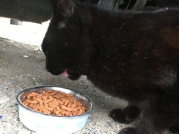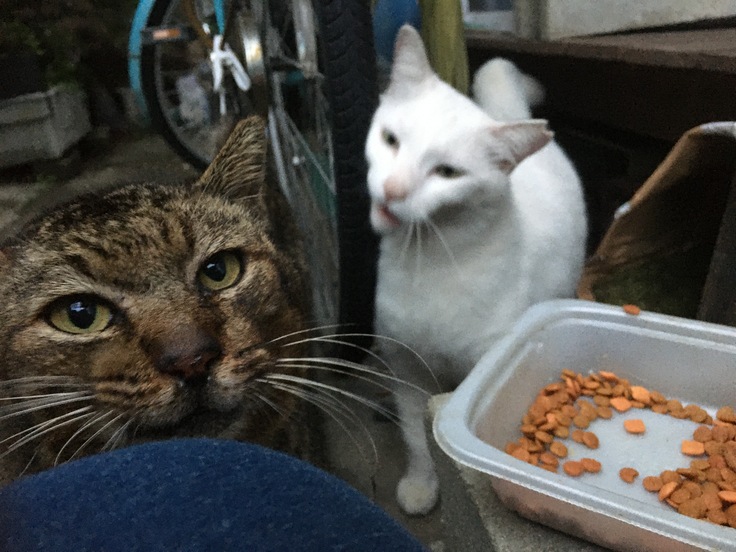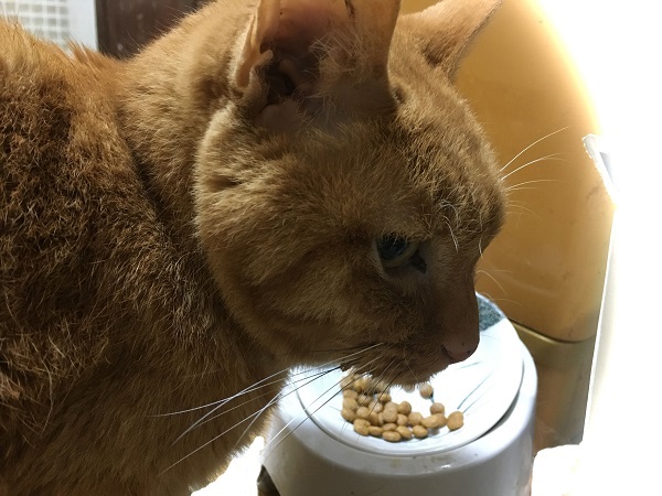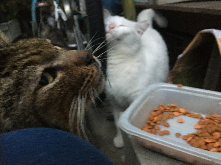 ジブリ邸にてカイトくん。器の小さい子。カリカリをレシーブする天空のキジ猫。大らかな茶トラ。