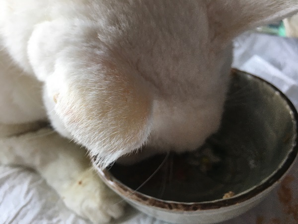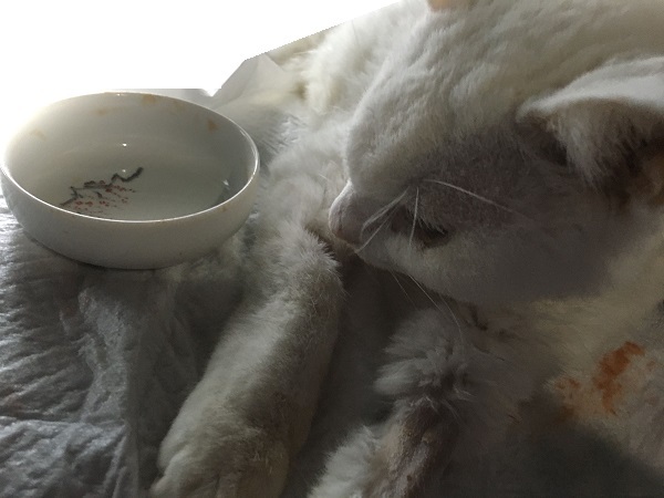 この朝、さくらは浴室まで自力で移動して、洗面器のふちにあごをあずけるようにしてお水を飲みました。