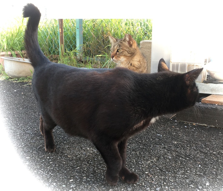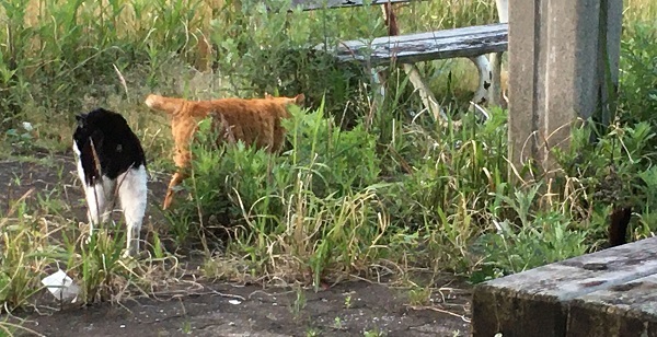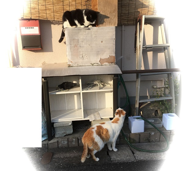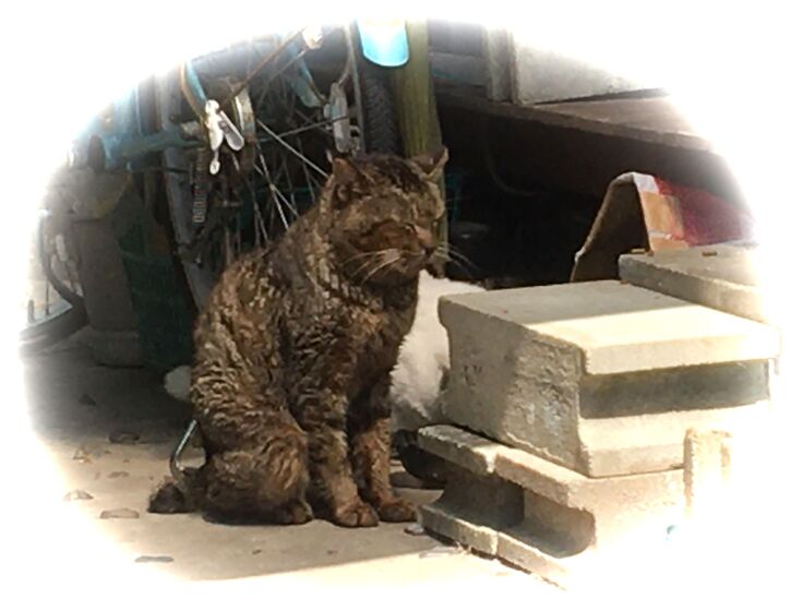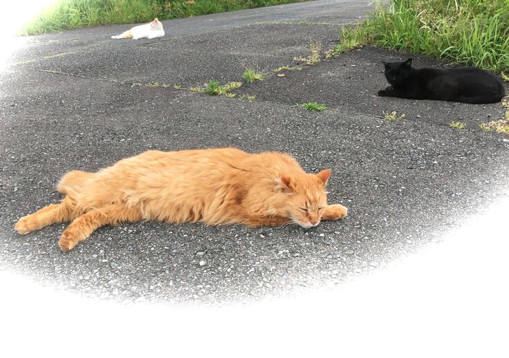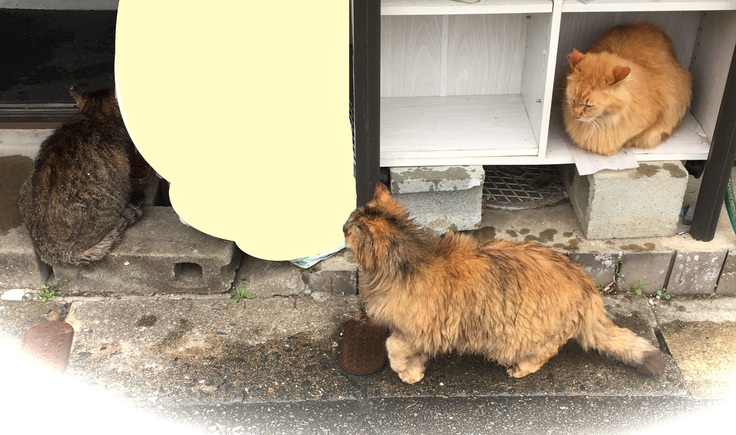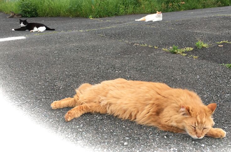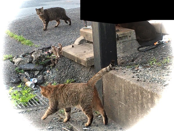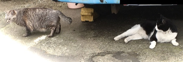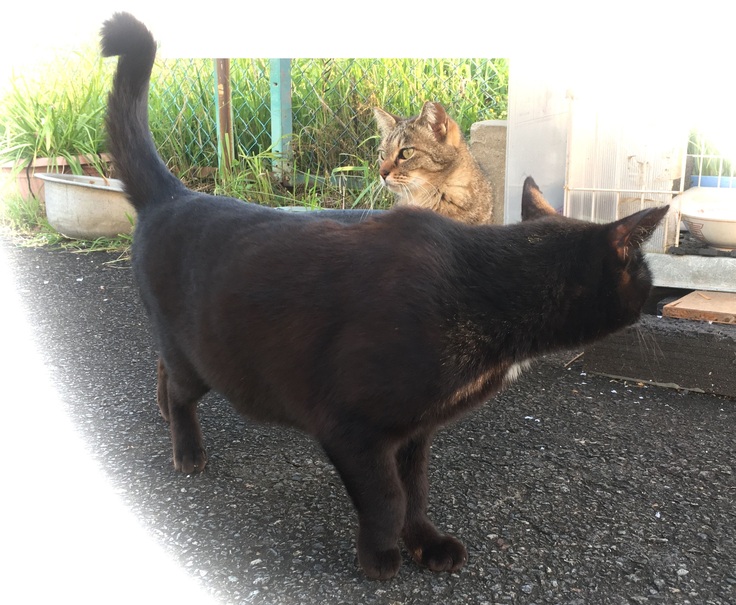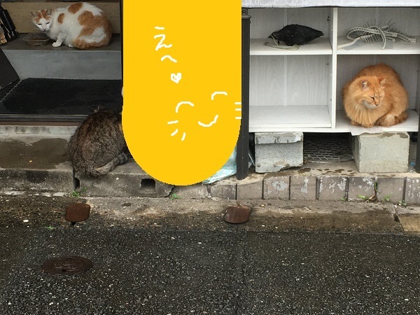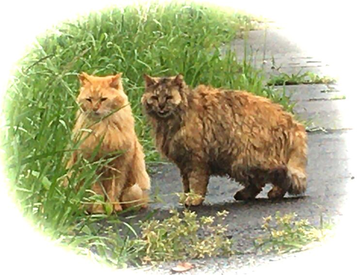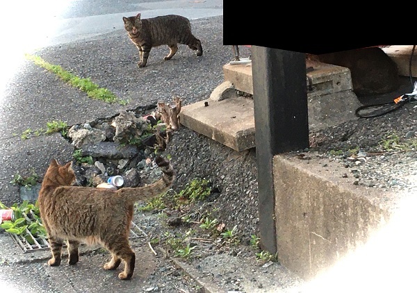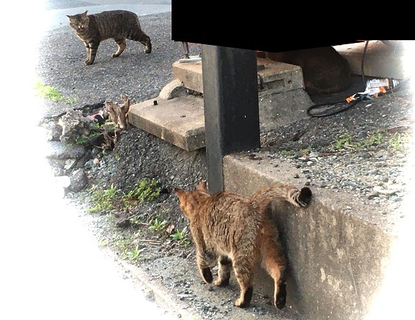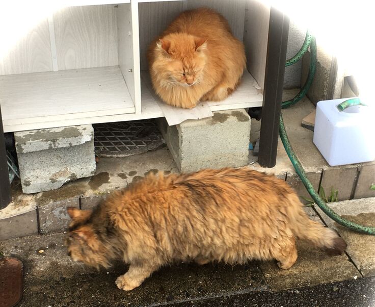 西川のりお社長邸近くにて、大らかな茶トラと器の小さい子。