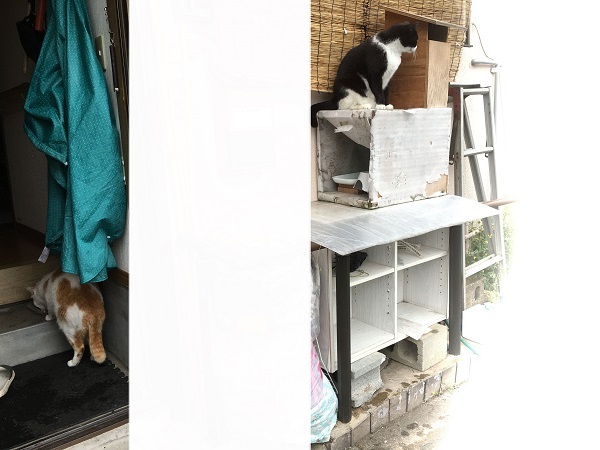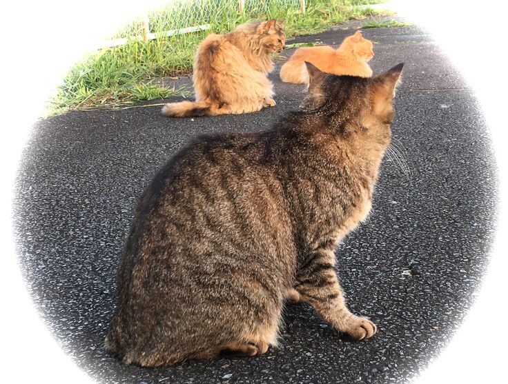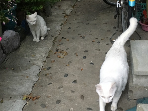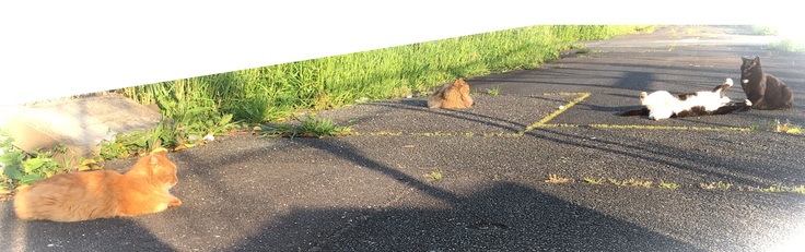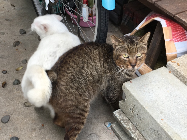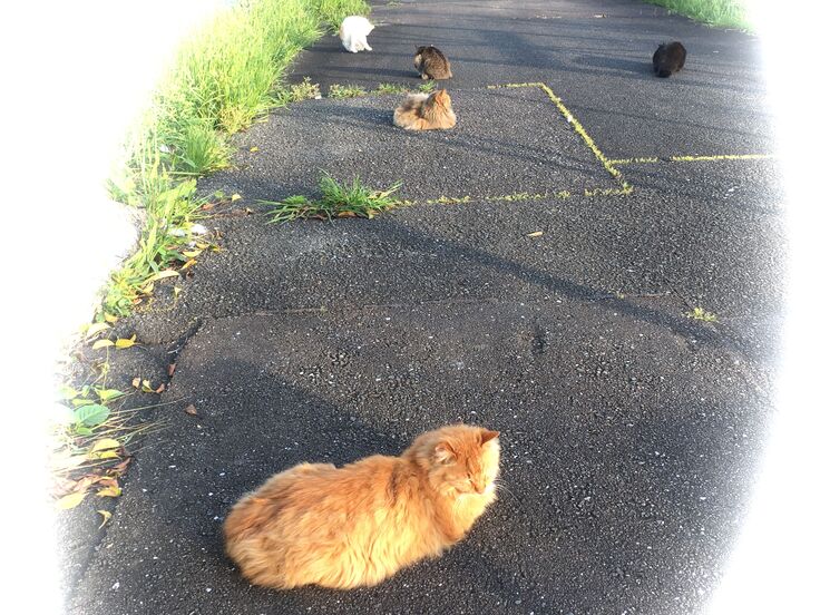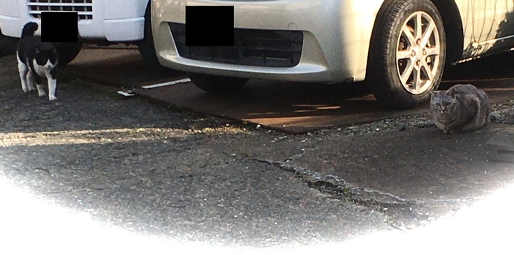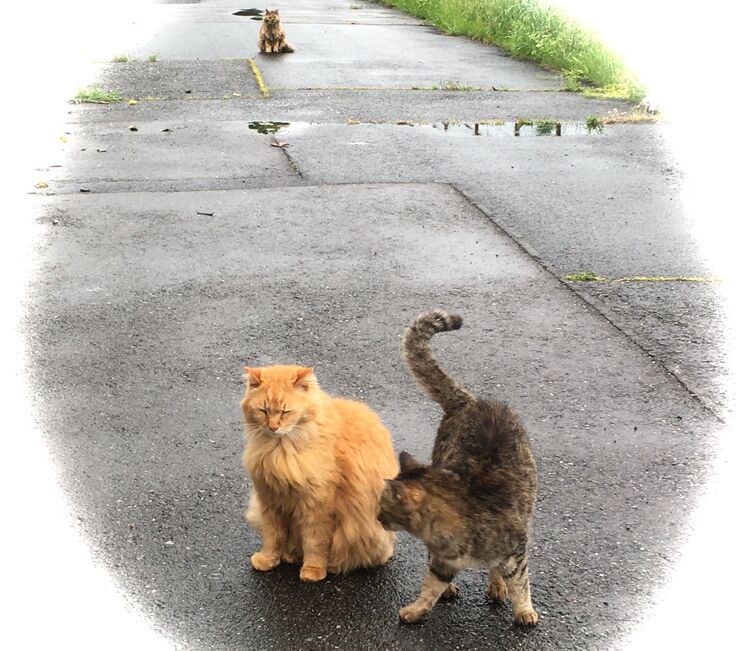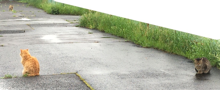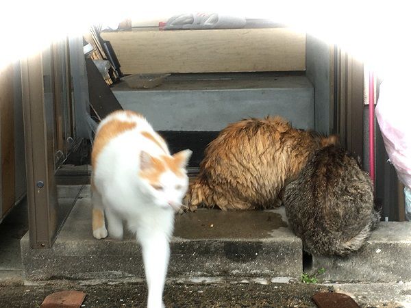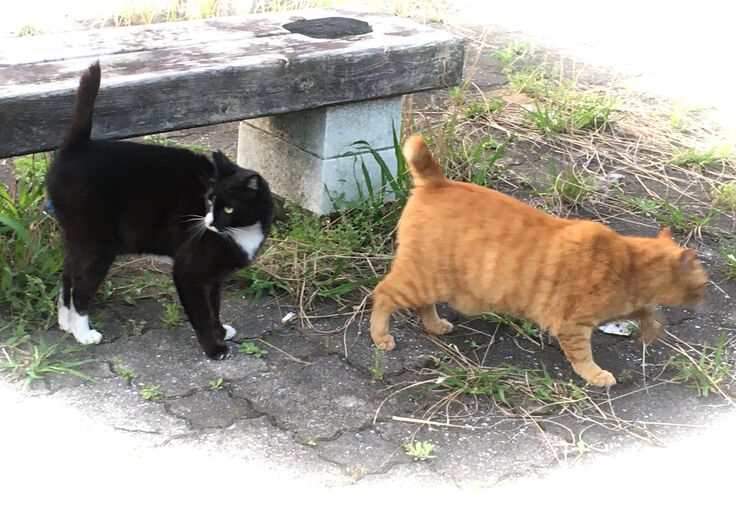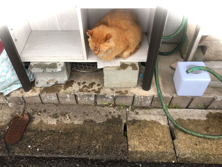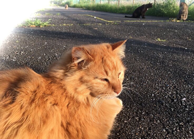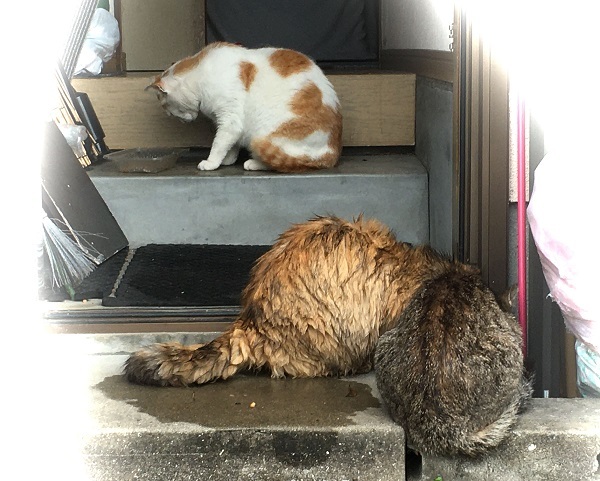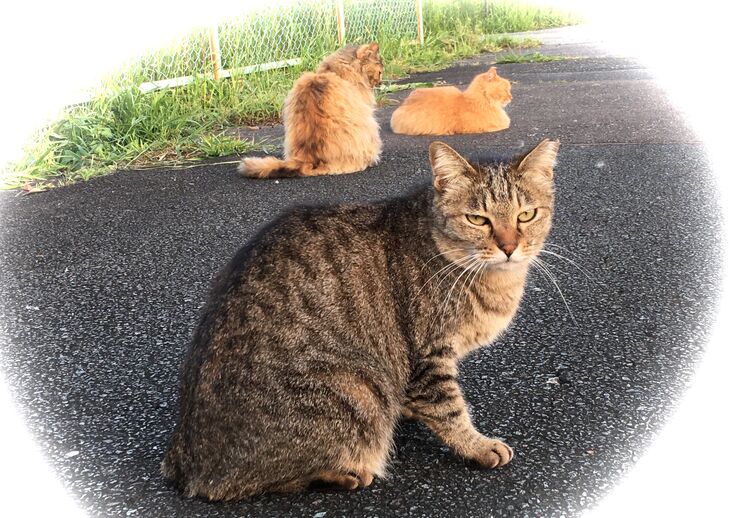 西川のりお社長邸近くにて、大らかな茶トラと器の小さい子。