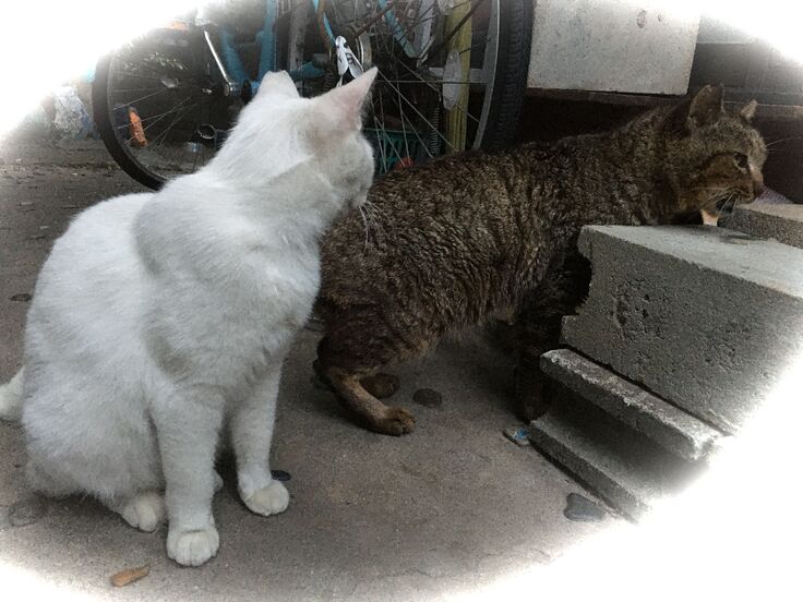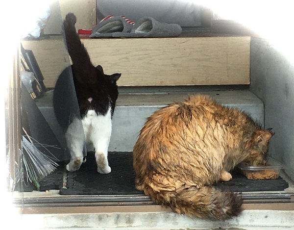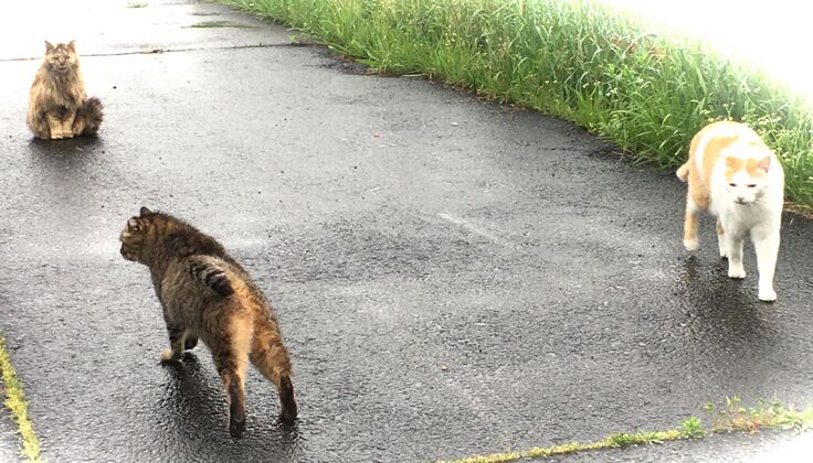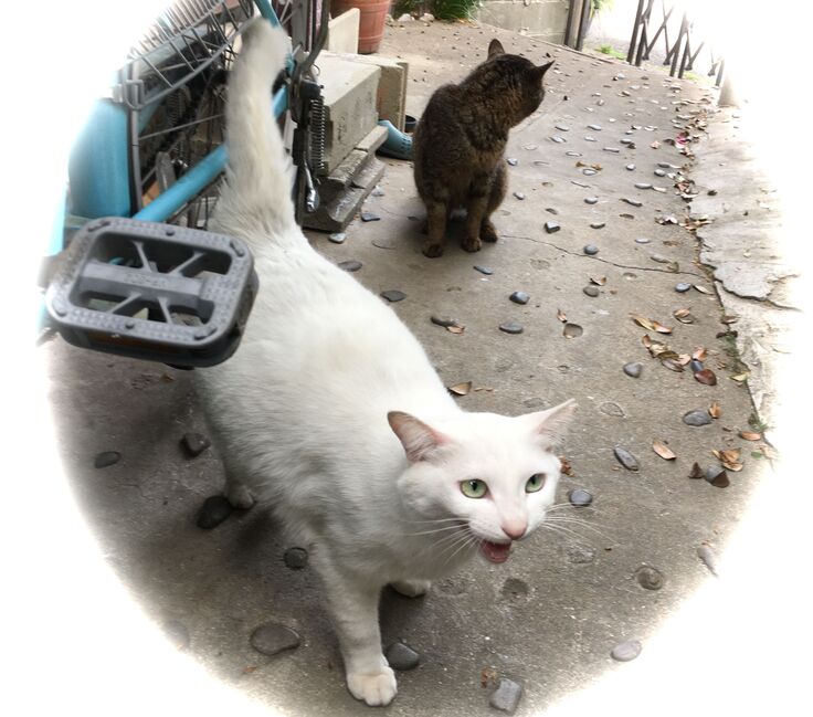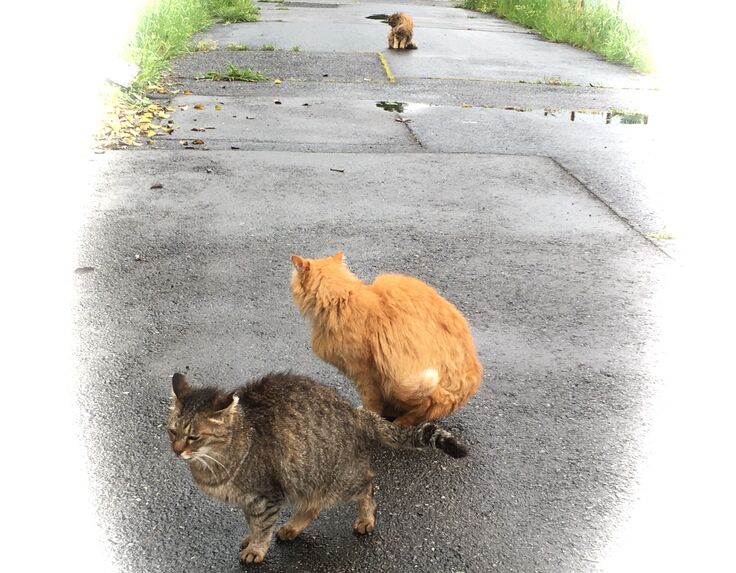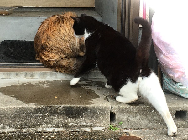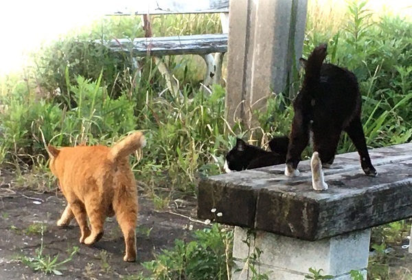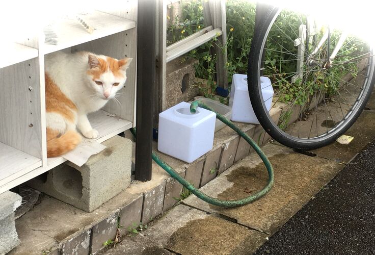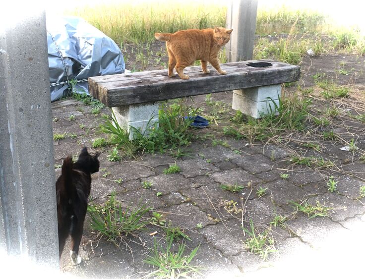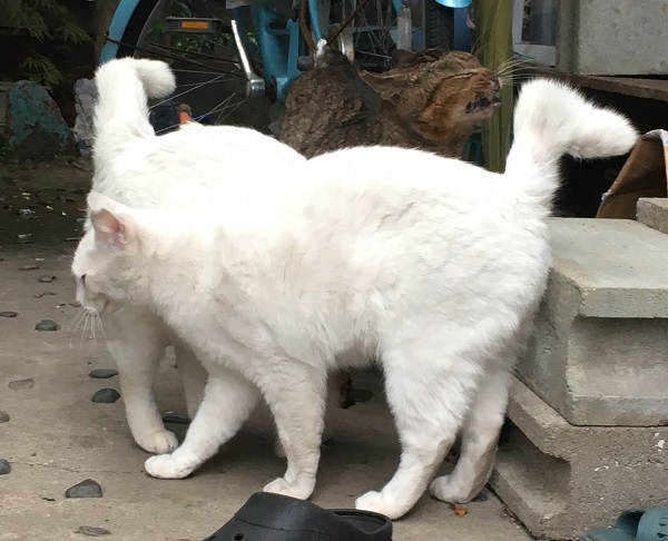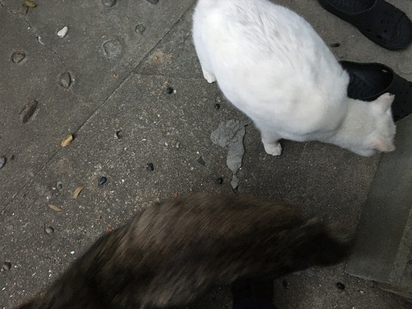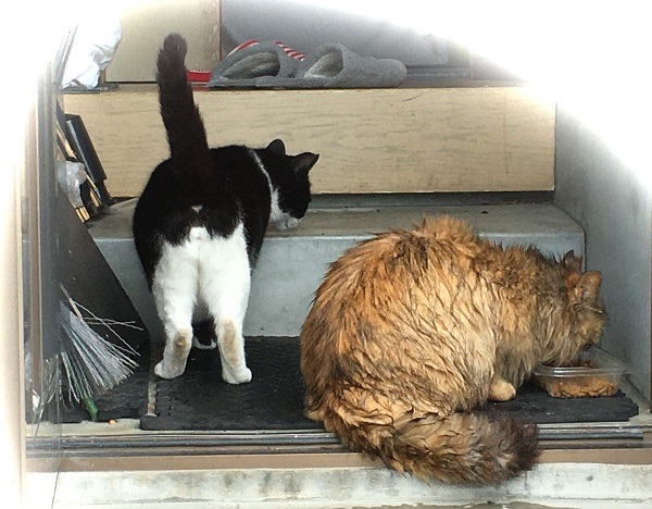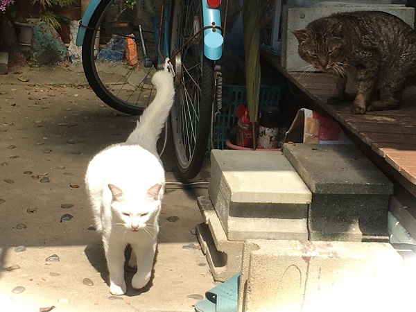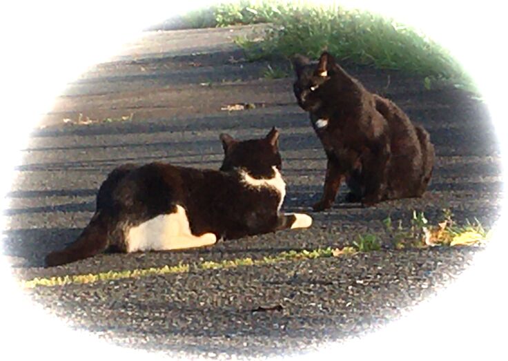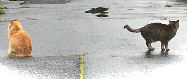 西川のりお社長邸近くにて、大らかな茶トラと器の小さい子。