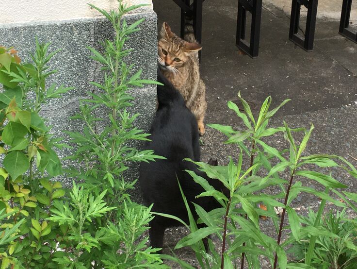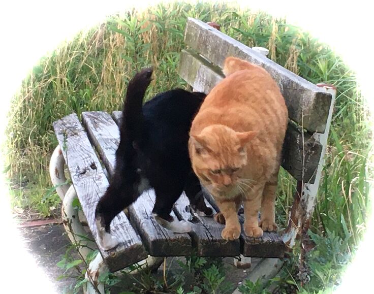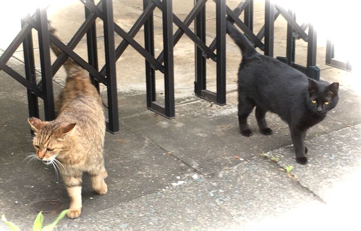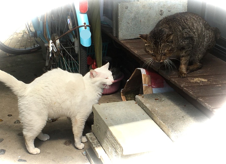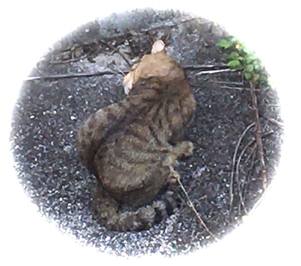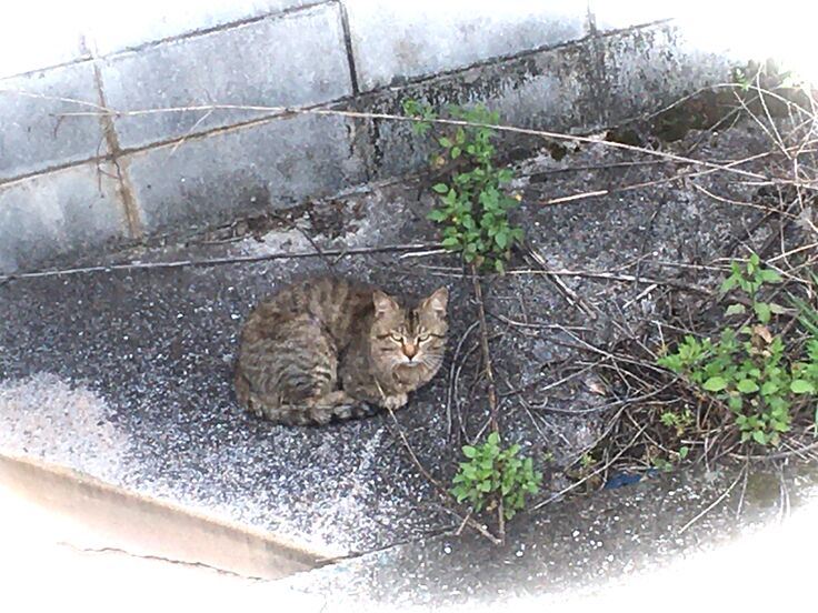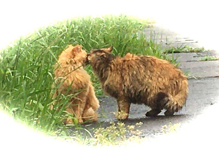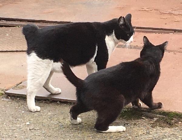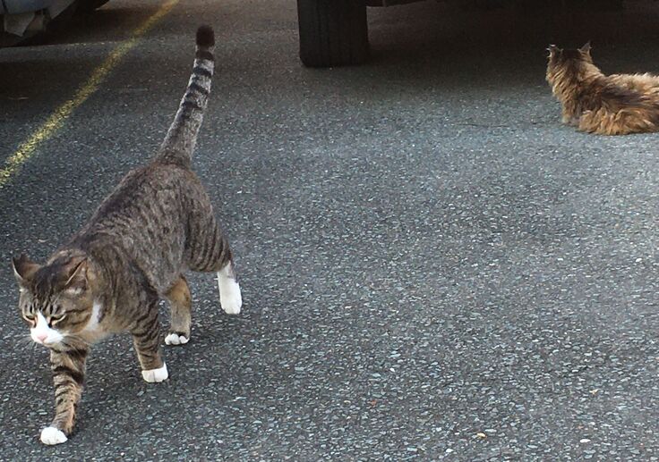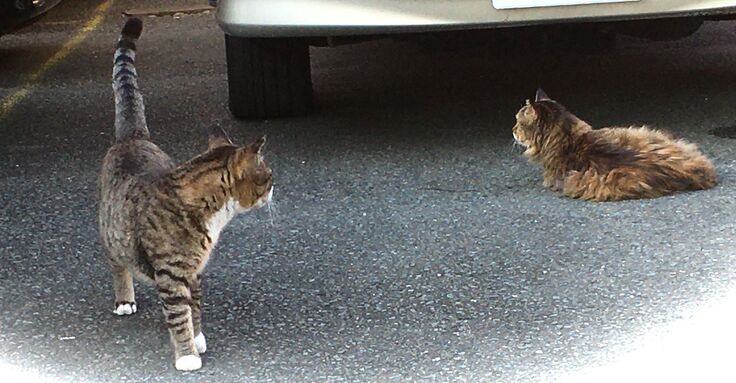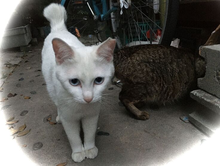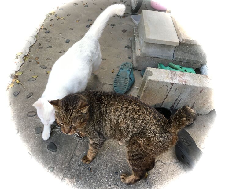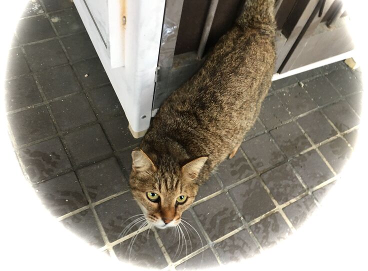 西川のりお社長邸近くにて、大らかな茶トラと器の小さい子。