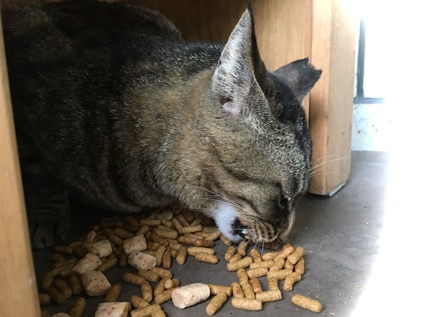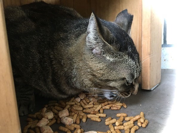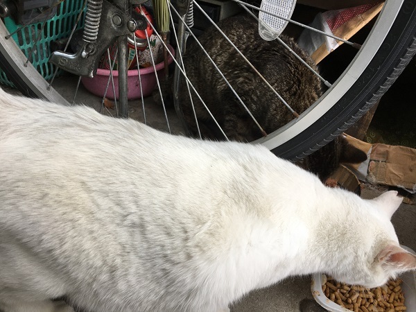 二年くらい前、ここに現れた時、ガリガリにやせていたぽぅちゃんは、皆から攻撃される隙を狙って、ゴハンを食べに来ていました。