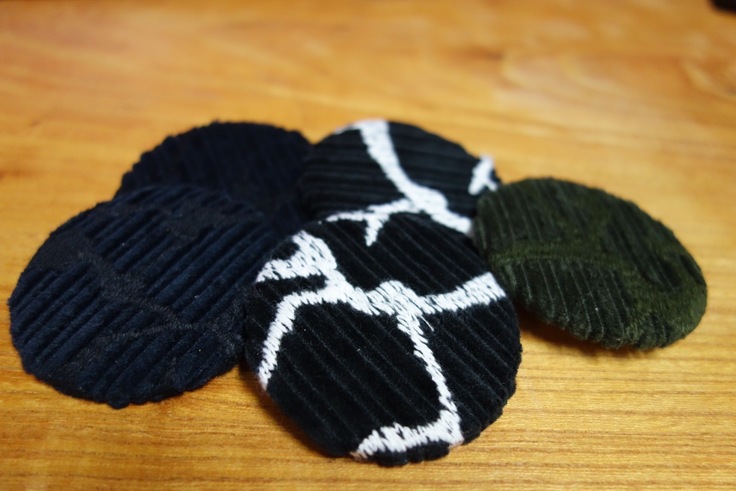 服の製品を裁断した時に出た残布を使って缶バッチを作りました。刺繍の柄が複雑なので型を抜いた場所で見え方が全然違います。
