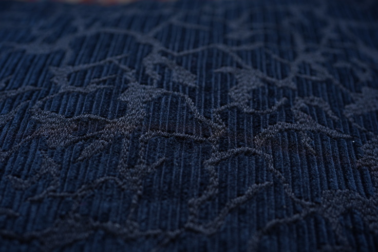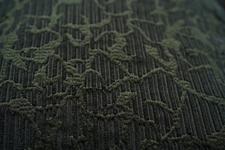 また刺繍量と柄の複雑さが他社ではマネできないような技術力の高い物になっています。毛足のある生地に刺繍加工を行うことで刺繍を行なっていない場所が毛が立ち、加工をした場所の毛が寝るので柄が浮き出て見えるのが特徴です。