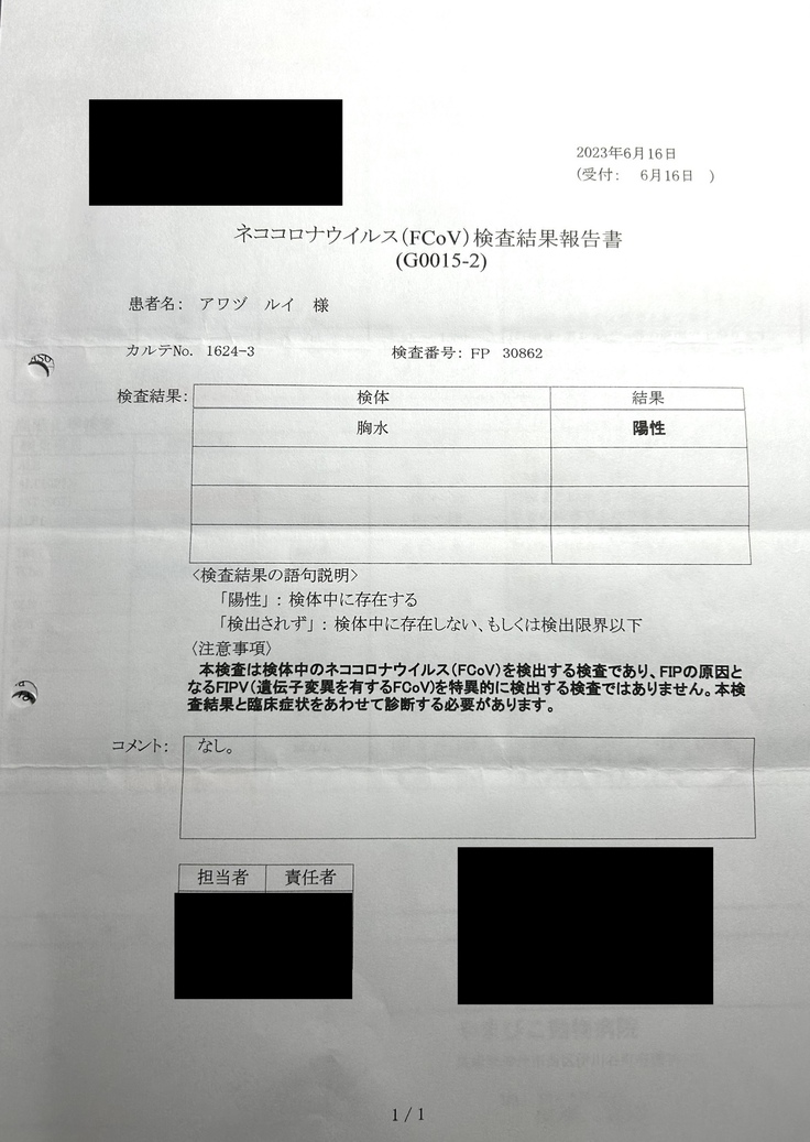 2023年6月16日病院より電話があり、FIP(ウエットタイプ)陽性の診断を受けました。