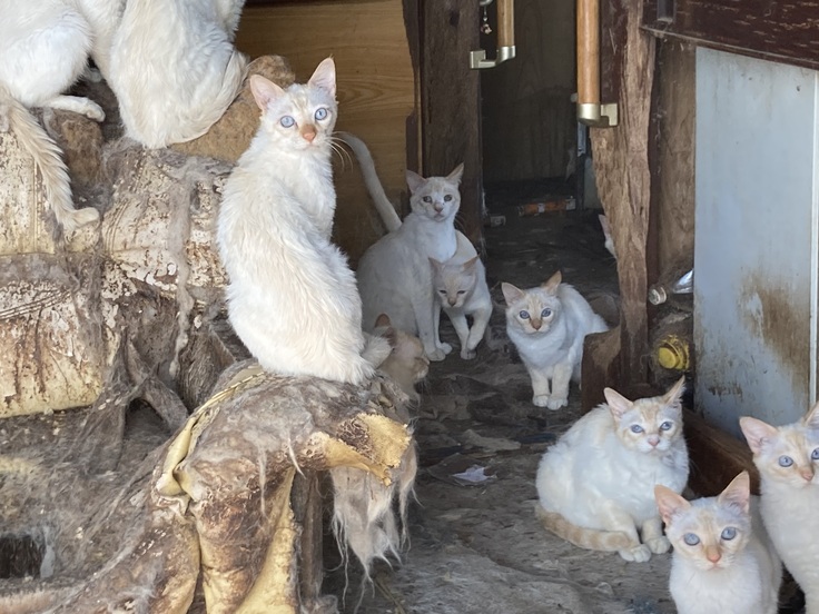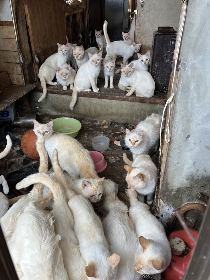 近親交配を長年繰り返されたため、全頭同じ毛色です。また中には奇形で前足が曲がり歩くのが不自由な猫、目や耳が機能していないと思われる猫もいます。