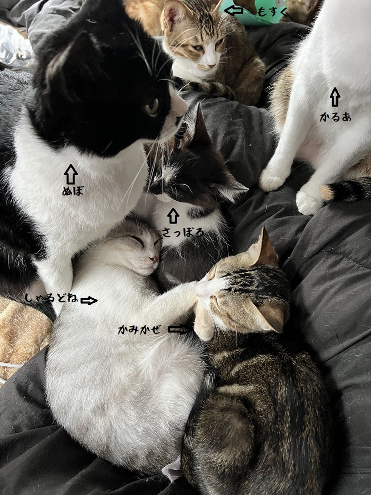 ヌーボだけが目覚め、何を考えているか分からない表情をしています(笑)