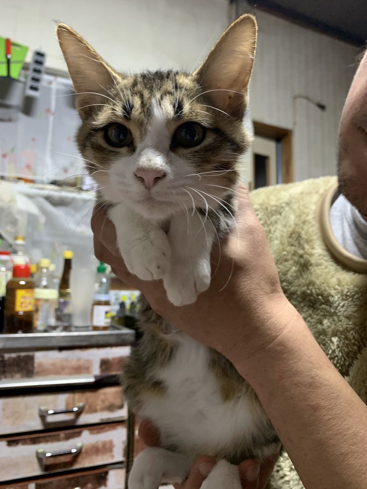 体格は小さめなのですが、おそらく5か月くらいとの事。毛並みも綺麗でトイレもばっちりなので、もしかしたら近所の家から逃げてきたのかも。