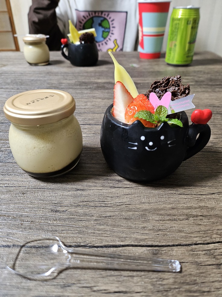 写真はデザートで頂いた手作りプリンと、ケーキ屋さんで買ってきた猫ちゃんケーキ。