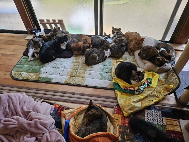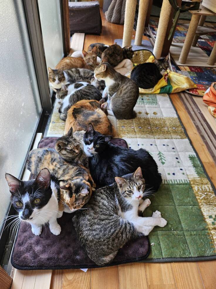 私たちの作業の効率を考え、縁側に一列に設置しておりました。最近やたらとトイレ側で過ごしている子が多いなと思っていましたが、どうやら日向ぼっこがしたいんだと気づき大移動を決行。