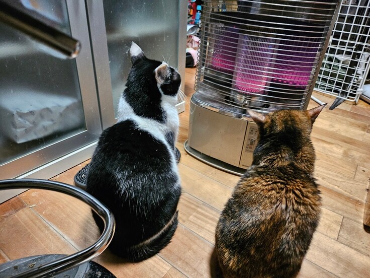 朝陽とカルピスはストーブの前で仲良く過ごしています。カルピスのお母さんである、チューちゃんが急死してしまい、庭に埋葬しました。やっぱり悲しい別れは慣れません。