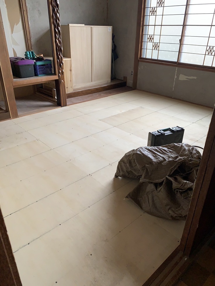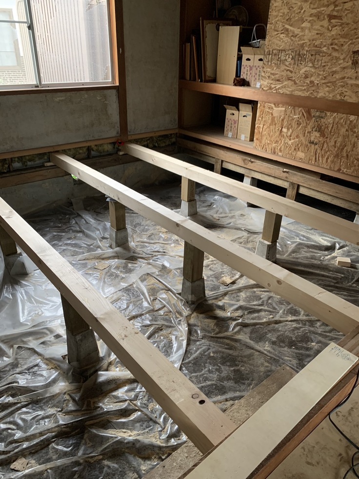 1階の和室を洋室にする工事です。土台の木がダメになっており、取替となります。今後の為にビニールを敷いてもらってます。