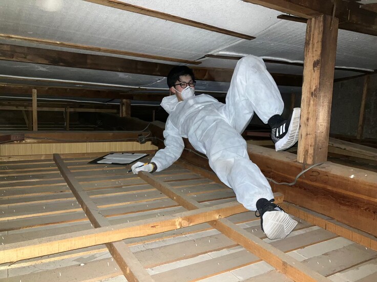 屋根裏や床下はほこりが凄いので防護服や防塵マスク・ゴーグルを装備し、いざ出陣。