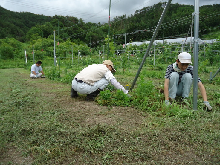 その中で「ふぁーすとすてっぷ」では、開所後より「農業と福祉」の連携をテーマに耕作困難土地を譲り受け、農業者の指導を受けながら障がいを持つ利用者と共にワイン用ぶどうを生産し、産地の継続再生を図っています。