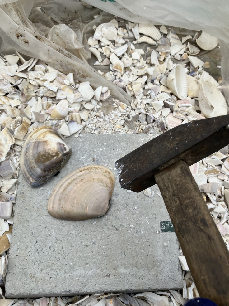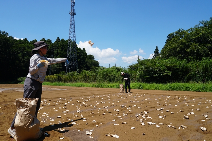 海藻と一緒に取ってきた貝殻も砕いてから畑に入れます。