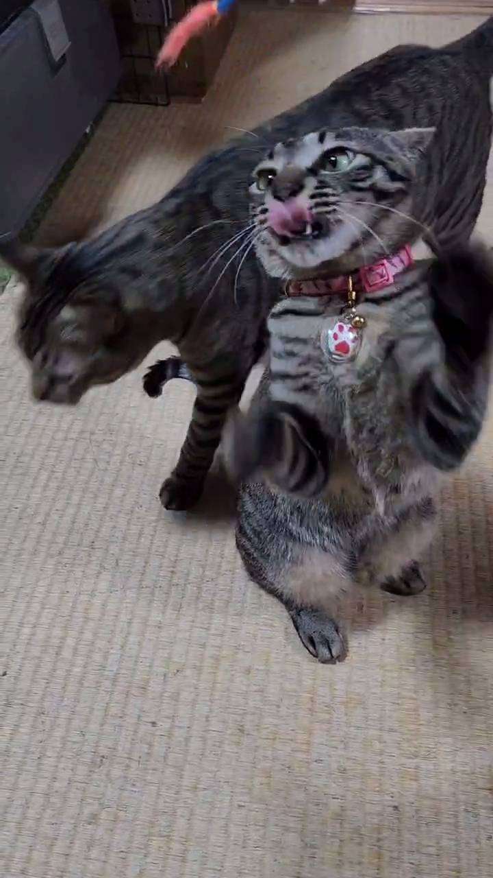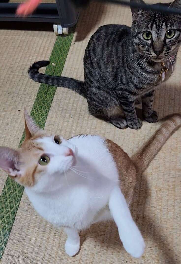 お姉ちゃん猫の咲希ちゃんと一緒に猫じゃらしを目で追っている姿が