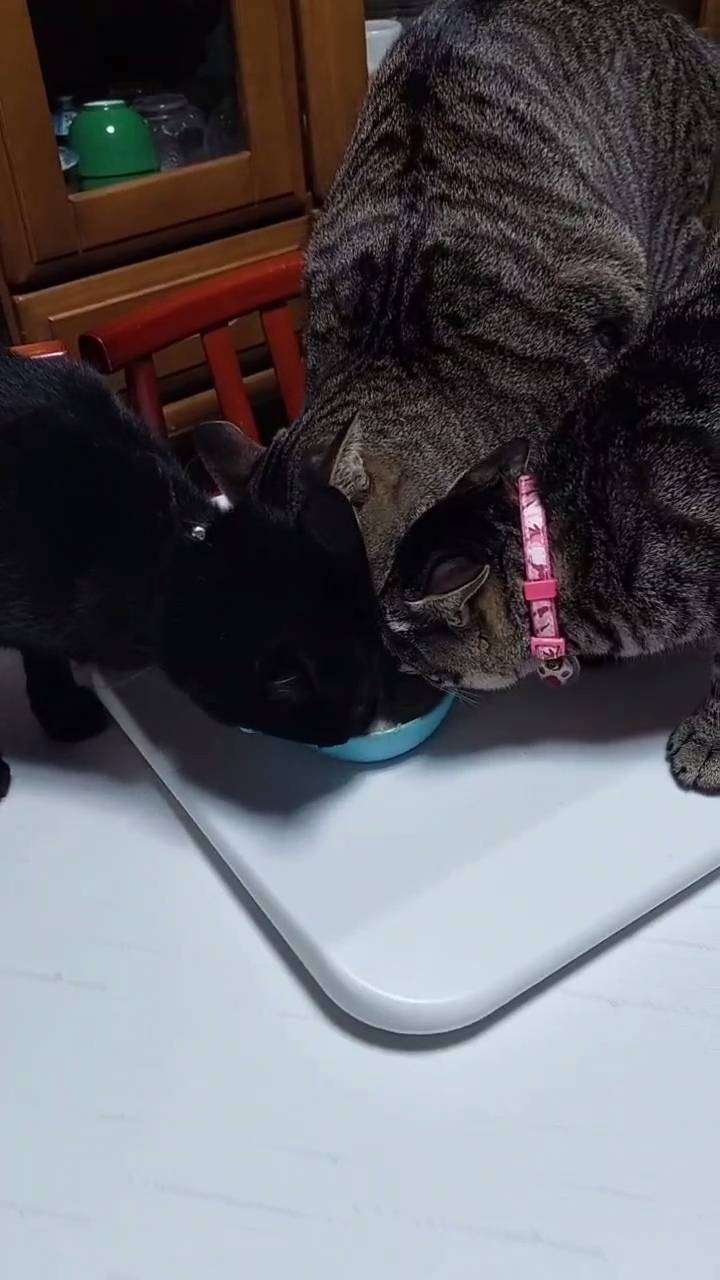 喧嘩をしたり、威嚇をすることもなく、仲良く食べている姿に癒されました🐈