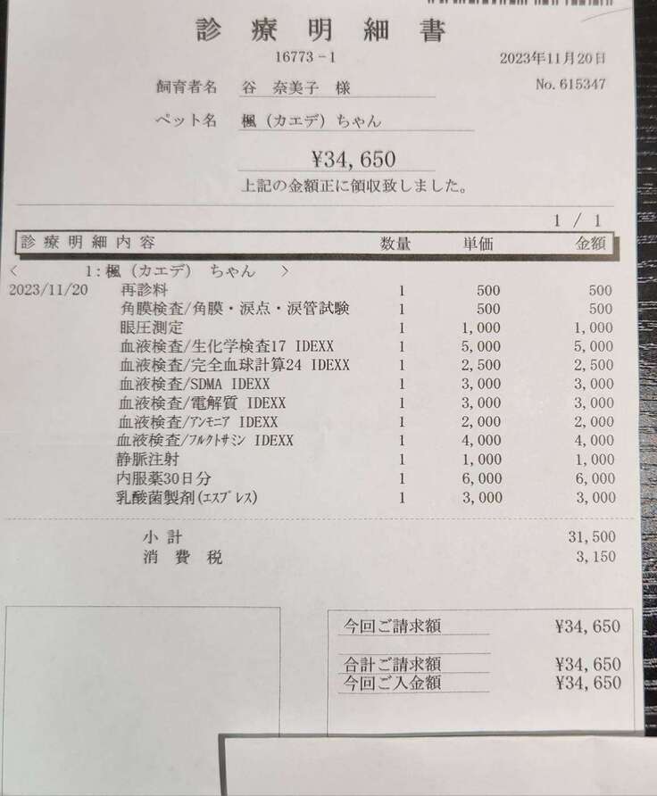下記の写真は今回の領収書になります。