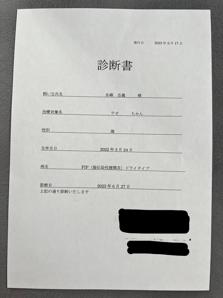 そうではない事を願いながら、すぐさまFIP(猫伝染性腹膜炎)の治療をしている病院を探し連れて行きました。