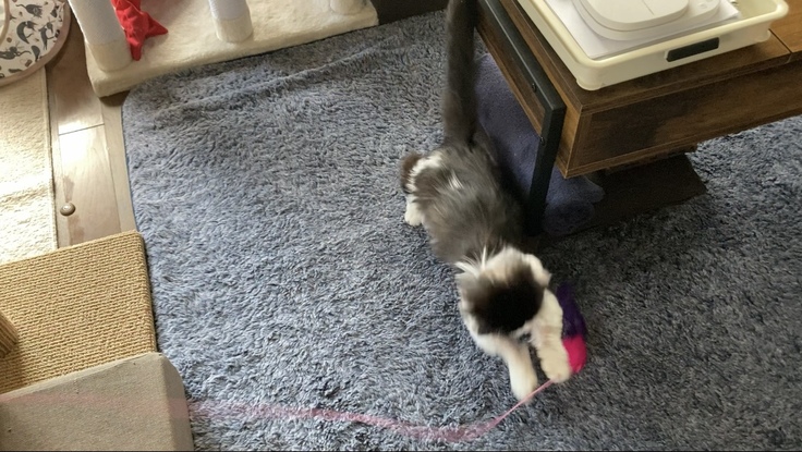 夕方にはおもちゃを引っ張り出して来たので遊んでると、タワーの支柱にジャンプして抱き付きました!