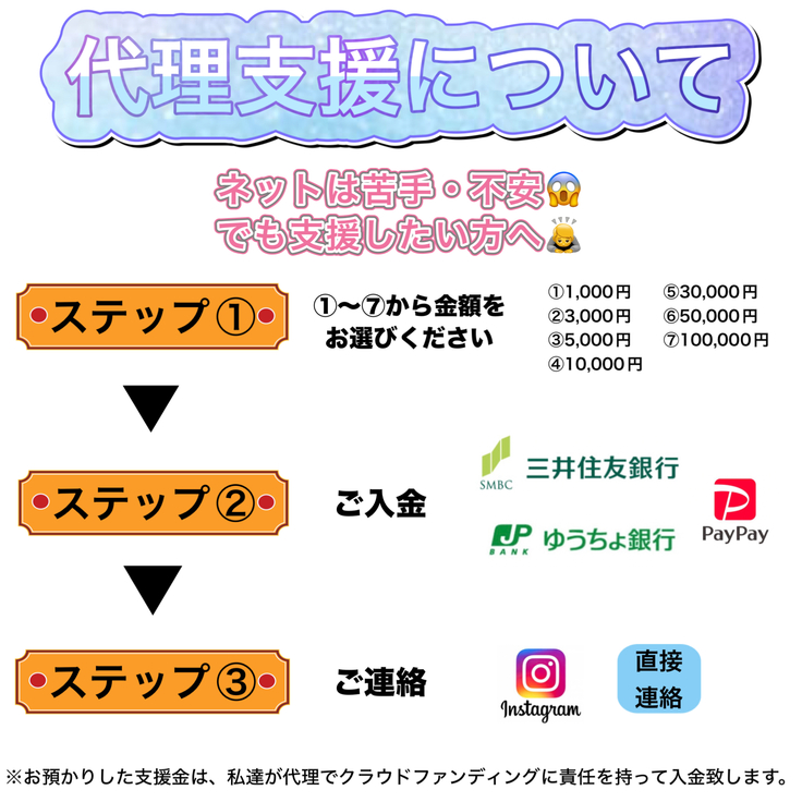 💡代理支援とは・・・ご支援者様から、私達が支援金をお預かりして、私達がご支援者様の代わりにクラウドファンディング【READYFOR】へ支援金を入金する方法です。