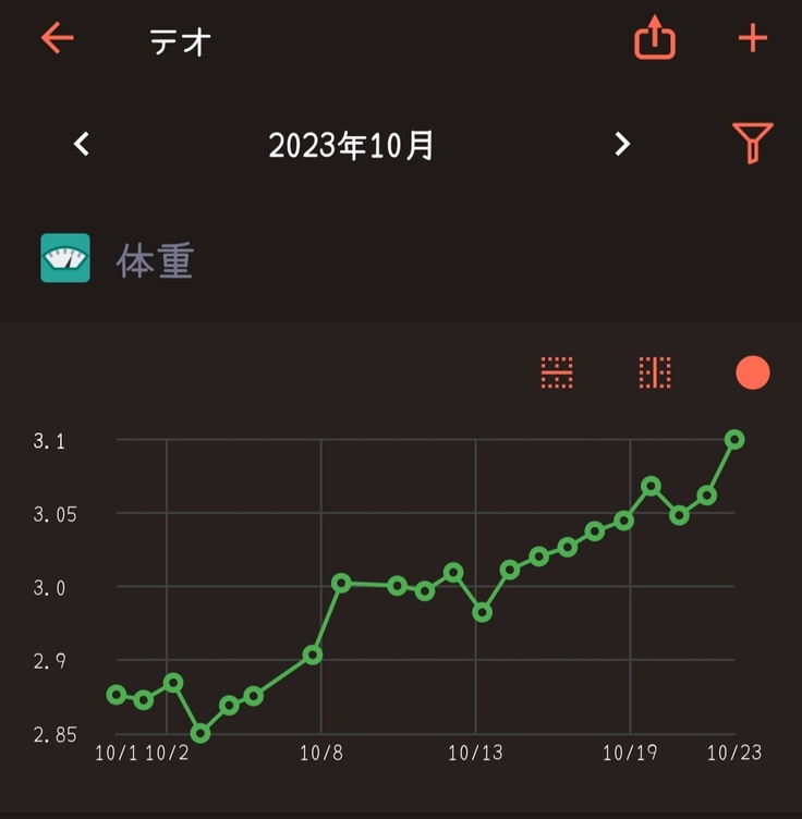 多少の増減はあっても、1ヶ月で見ると確実に体重を増やしてくれているテオくん。