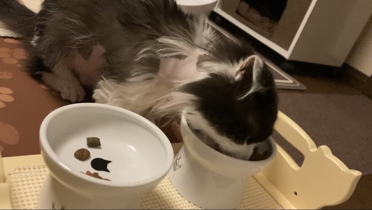 起こして「ご飯食べようね」と声を掛けると、まずはカリカリへ向かい少し食べてこちらをじっと見てきます。