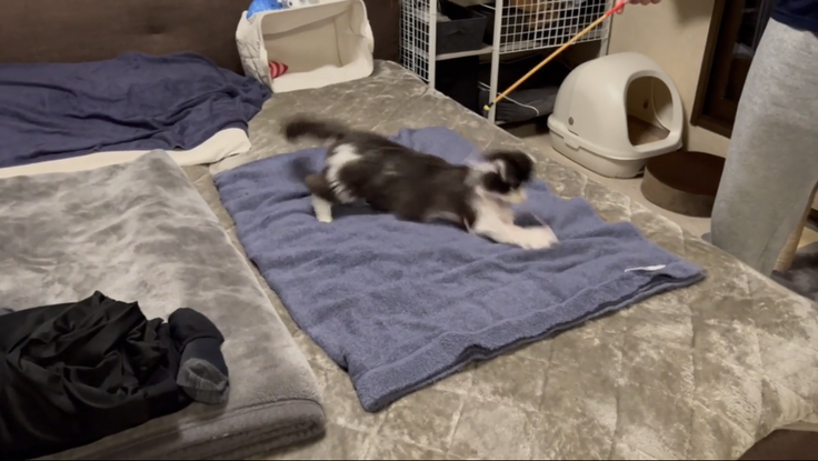 ネズミやヒモのおもちゃで部屋まで誘導します。