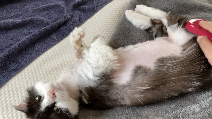 脇腹から足の付け根あたりは気持ちよかったのか、クネクネしたり寝返りしたりしてゴロゴロ言ってくれてました。