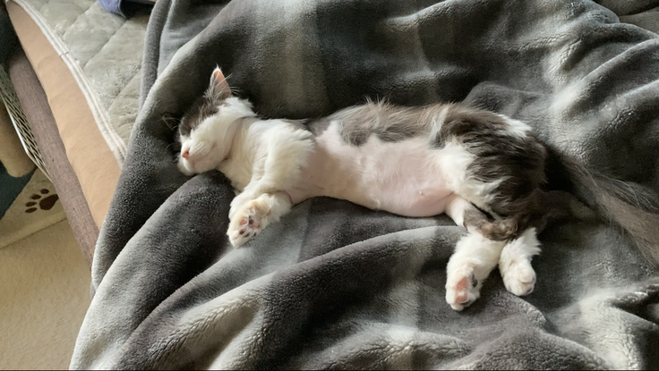 私達の足元で寝ていて、起きておトイレに行って、また私達の足元に戻って来てグルーミングを少ししてから二度寝してました。