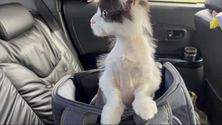 途中、神経症状でふらつきがある後ろ足を踏ん張ってキャリーの中から立ち上がり、車の窓の外を眺めるテオくん。