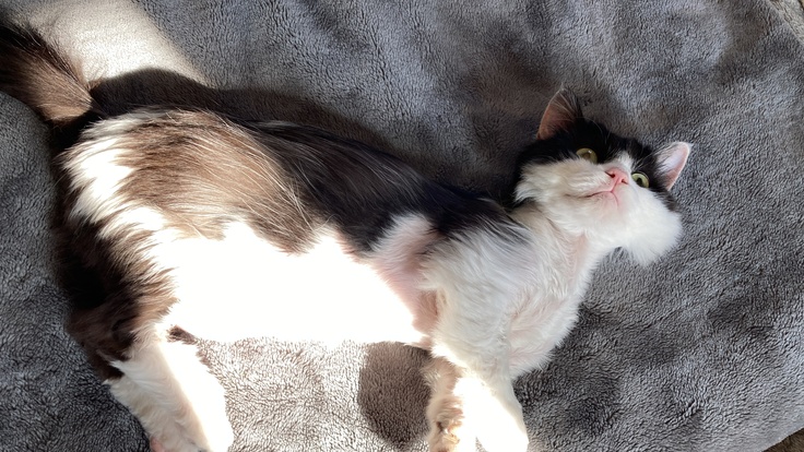 撫でた時に背骨の凹凸はほとんど分からず、お尻の骨も体勢によっては、神経症状でコテンとなってしまった時に心配かな?くらいお肉がついてきました。