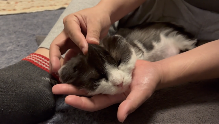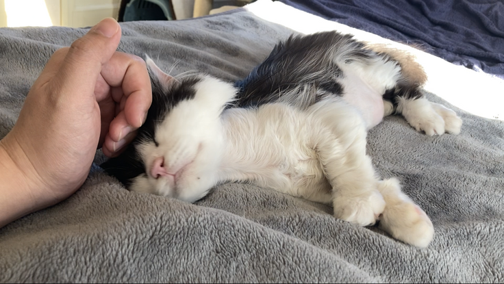 たくさん遊んだあとは私達の毛布の上でゴロゴロ。おでこを撫でると、気持ちいいのかこちらの手に押し付けてきてくれますす。
