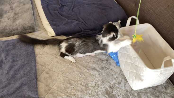 おもちゃを追いかけて、カゴに隠れたおもちゃもカゴをぐいっと変形させておもちゃを捕まえました(布生地の柔らかいカゴです)