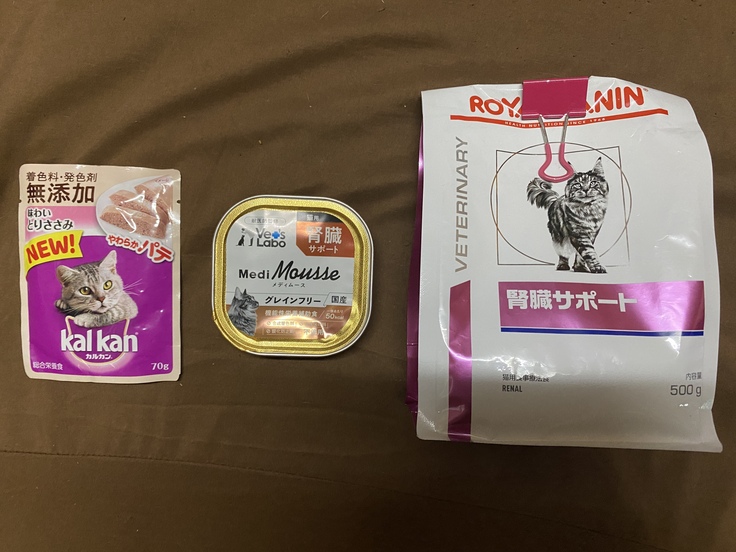 食べているフードはこちらです。ロイヤルカナンの腎臓サポートのドライフードは砕いてお湯で溶かしてます。皮下点滴は火曜日、金曜日はお休みとなりメディムースという水分多めのウェットフードを混ぜています。メディムースはあまり口に合わないようで、アビの好きなカルカンのパテも混ぜてあげています。火、金以外はドライフード15gとパテ半分となります。