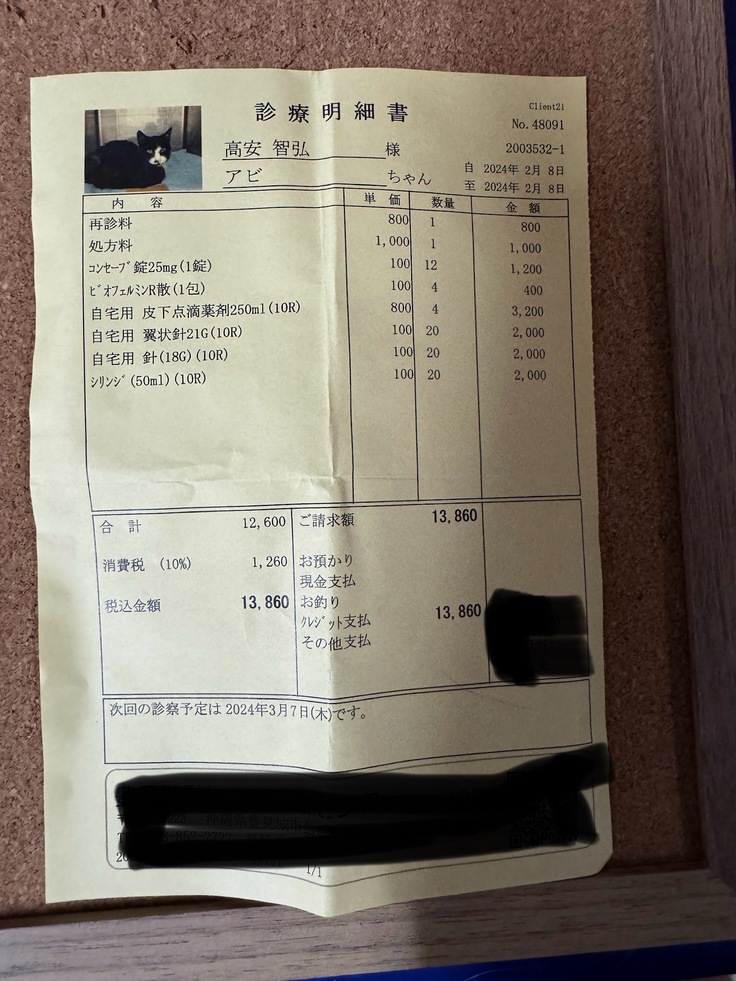 飼い主の方が体調崩しまして先週は40℃近くの熱が出てしまいました。なるべく自分にお金かけるのは避けたかったんですが、気を抜いてしまいました。。