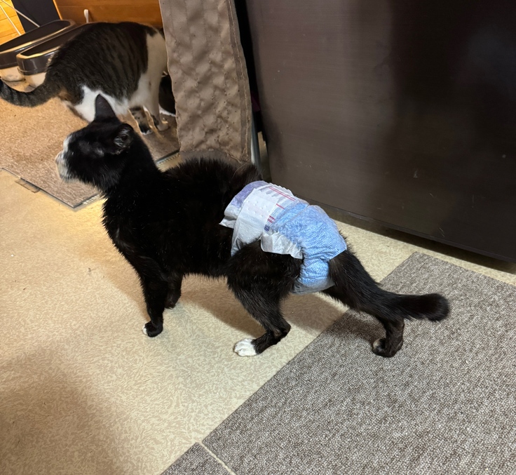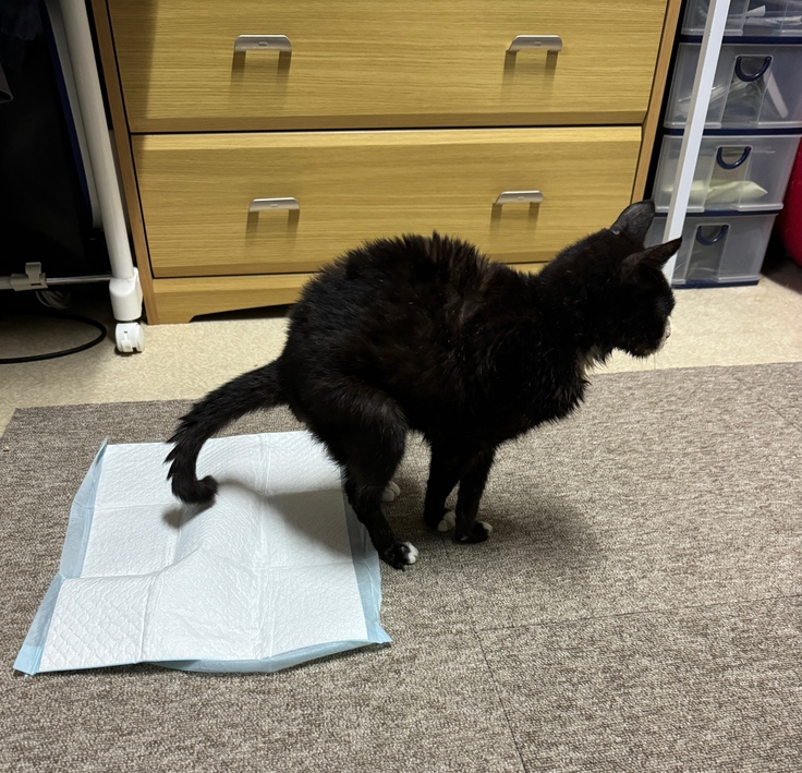 こうゆう状況が続いており、一番はオシッコに悩まされておりまして、ついにオムツデビューとなりました💦あまりしたくなかったのですが、部屋がもうとんでもなく臭くなってしまうので。。