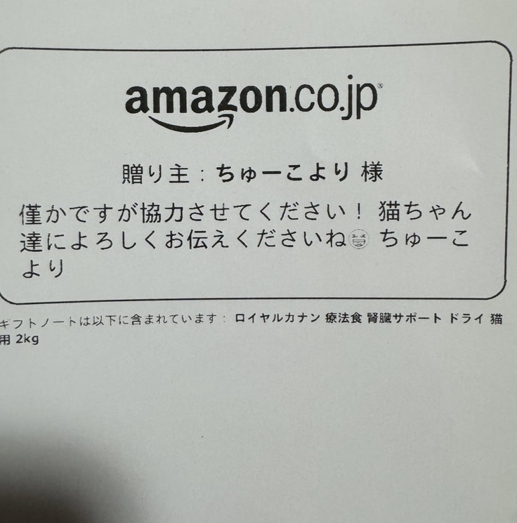 ちゅーこ様より、腎臓サポートドライフードの物資支援がありました。