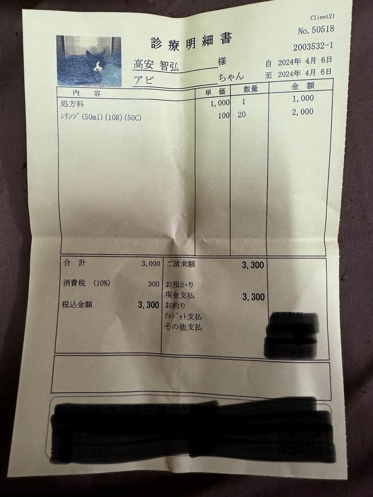 前置きがながくなってしまいましたが、翌日にアビの受診がありました。Xを見てくれてた方はわかると思うのですが、今回からかかりつけの病院で皮下点滴用の針2種類が処方されなくなってしまいました。こちらの病院にはアビが大変お世話になっており、家から車で5分もかからない為、病院は変更できない決断でした。