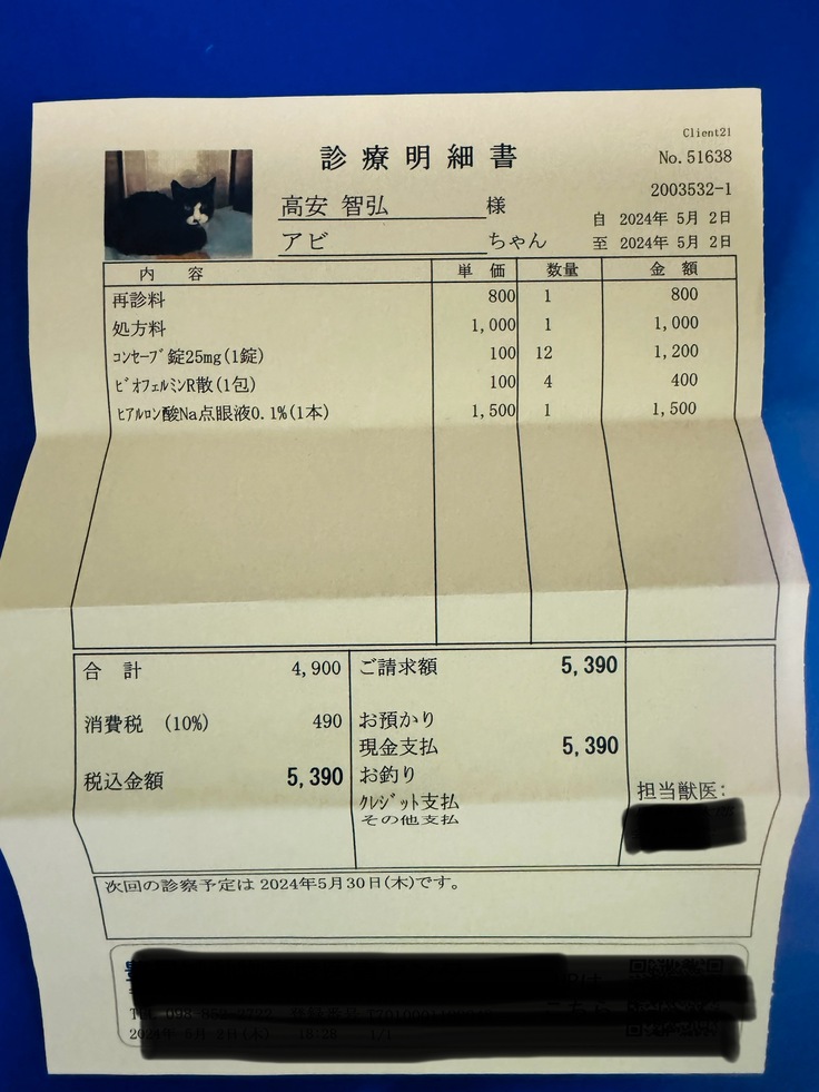 前回からもう皮下点滴の針が出せないという事で、別病院から処方してもらってますので、お薬代と目薬代だけでした。