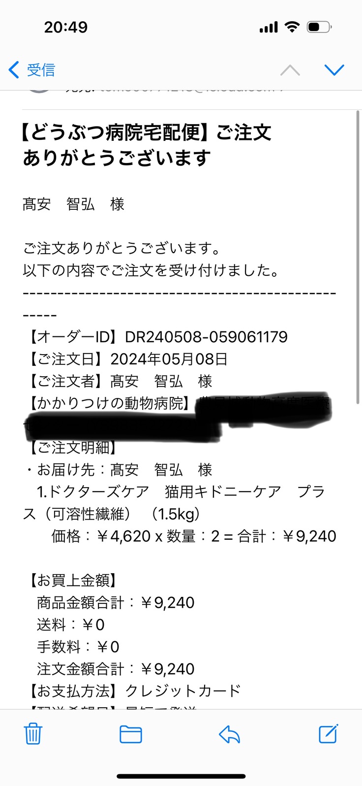 今回、お二人のご支援を受け、アビの便通と腎臓ケアの両方に対応出来るフードを購入することが出来ました。病院からサンプルもらった後、アビに食べさせたら食いつきがよく、また便通が良くなった為、今回念願叶って購入しました。7500円以上の注文で送料2500円が無料となるようで、2つ注文しております。