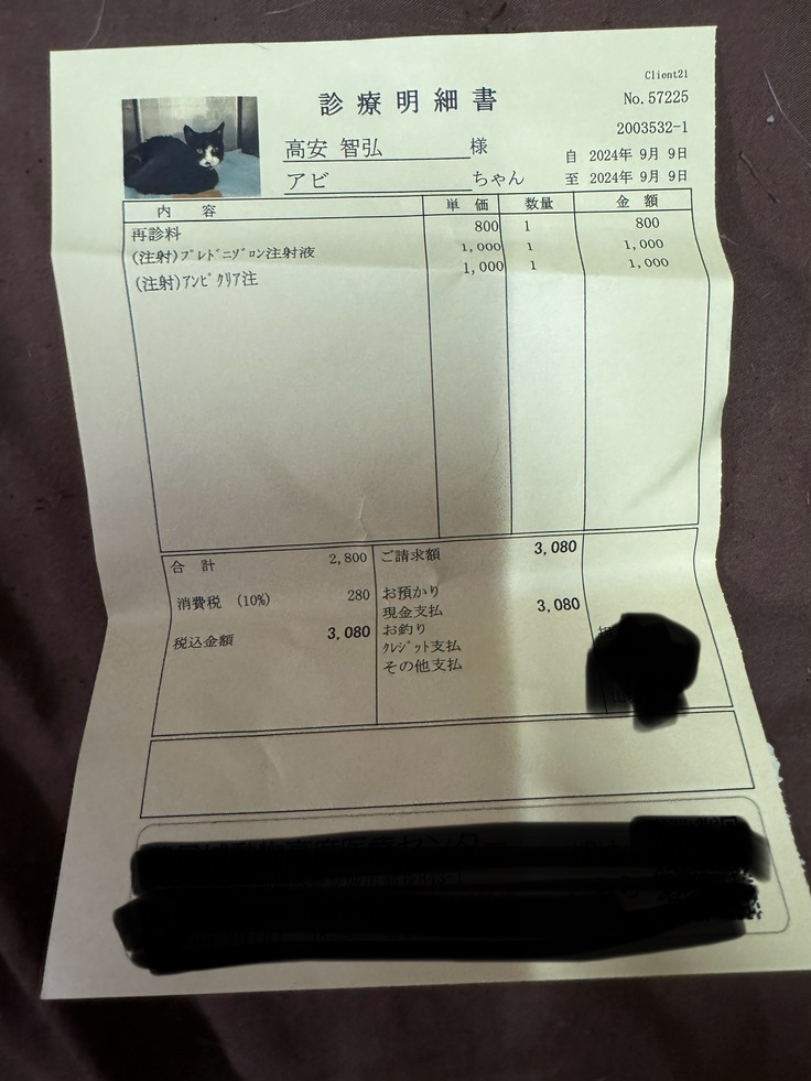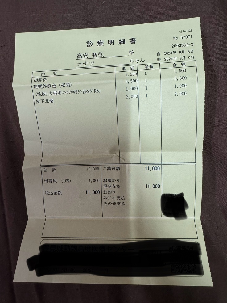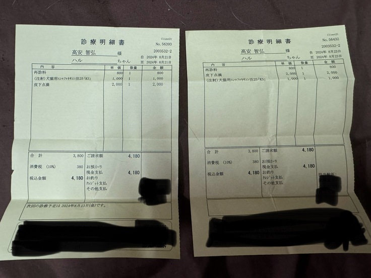 皮下点滴は家でうっていることもあり、病院ではサービスでうっていただきました。あとは抗炎症剤と抗生剤の注射。