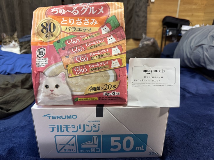 ちゅーるとシリンジを支援していただきました。本当にありがとうございます。
