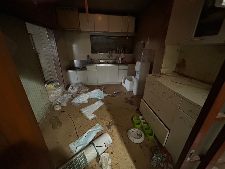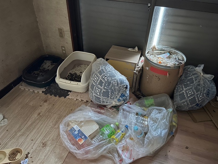 家主はすでに夜逃げ逃亡しており、残ったのは大量のペットボトル、中学生の制服等、押入れにしまわれたゴミ袋、そして僅かな家財、更に‼️遺棄された沢山の命たち、、、猫19匹、犬1頭でした。