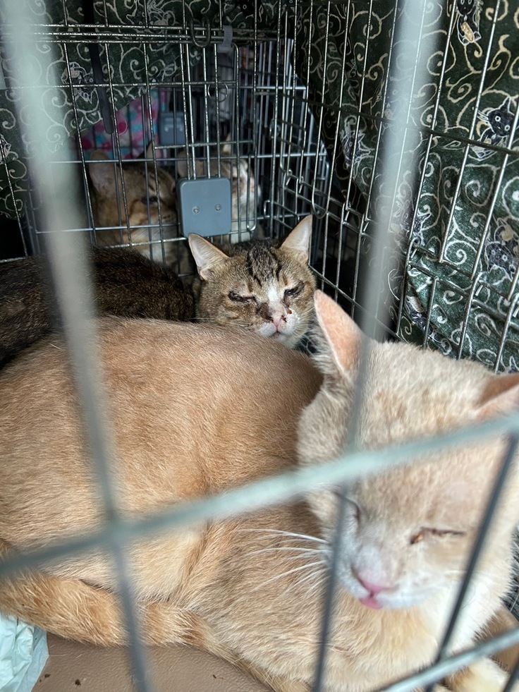 複雑な心境の中、何とか遺棄された命の保護は出来ましたが痩せてる子が多いのと、避妊去勢の最低限医療もされてなく涙目でやはり弱っている子が目につきました。遺棄されてから1週間以上はたっているようで
