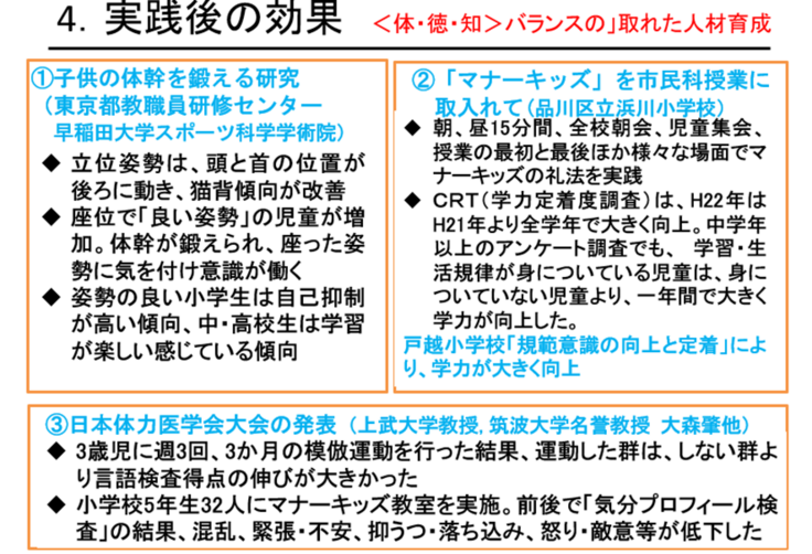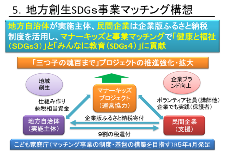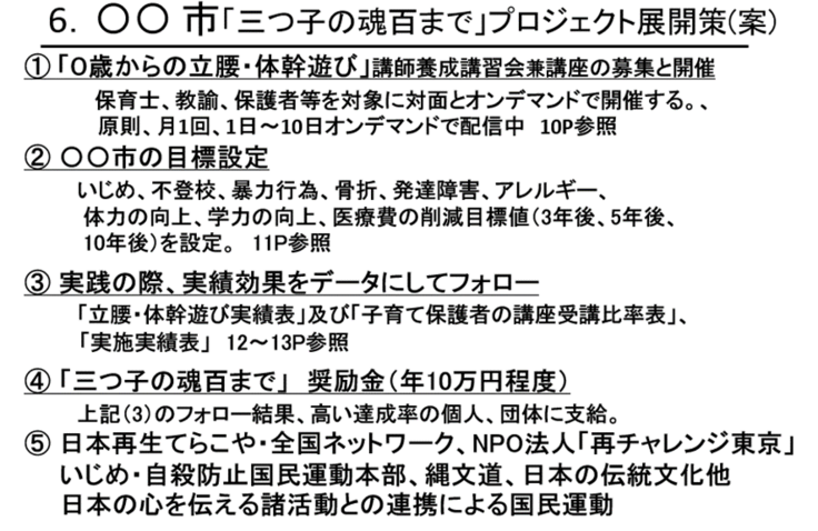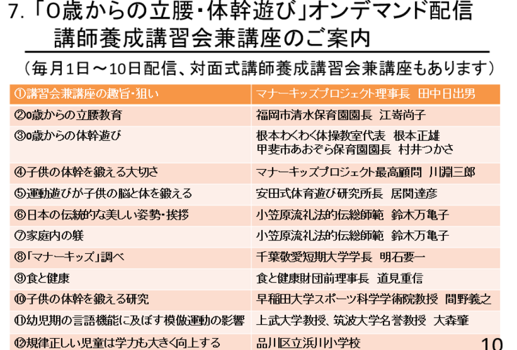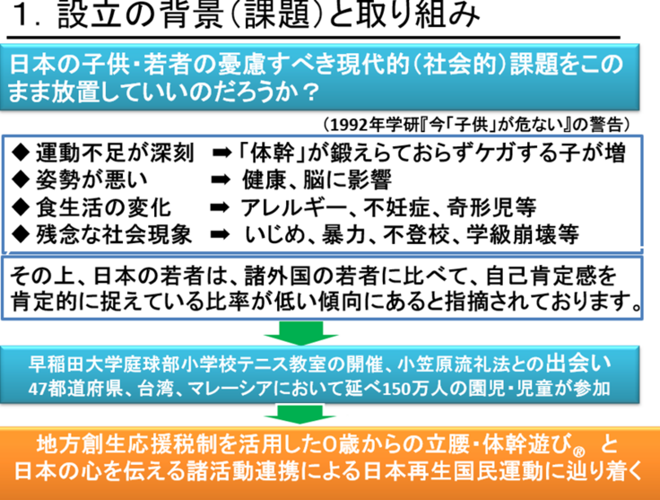 マナーキッズ活動を開始して26年経過しますが、内閣府地方創生応援税制を活用した0歳からの立腰・体幹遊びと日本の心を伝える諸活動との連携日本再生国民運動に辿りつきました。文武両道を目指すには、3歳からでは遅い、0歳から発達に応じた立腰(腰骨を立てる)・体幹遊び等人間形成の礎石となる「三つ子の魂」を育むことが必須であることにようやく気付きました。地方自治体が主体になぅて、目標値を設定し取り組む、企業は企業版ふるさと納税を活用して支援するのが特徴です。一人でも多くの教師・保育士・指導者・保護者の皆様方に受講して頂きたいと考えております。再度、世界の人々から尊敬される日本人を目指す絶好の機会かと思います。今こそ互いに助けあってたくましく生きる日本人の強靭な精神いわば「日本人の心」=「大和魂」を取り戻す上で、いささかでもお役にたてればと思っております。ご支援賜れば幸甚です。