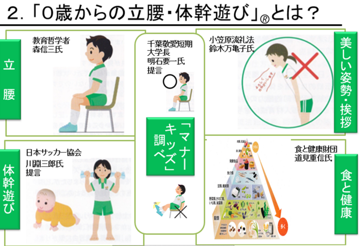 公益社団法人マナーキッズプロジェクトの田中日出男です。乳幼児、小学校児童が立腰(りつよう、腰骨を立てる)、体幹遊び等を体験し、<体・徳・知>バランスのよい人材を育てる活動を行っています。今までに47都道府県、台湾、マレーシアにおいて延べ150万人を超える幼稚園・保育園園児、小学校児童他が参加しております。