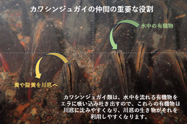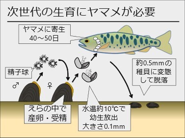 「カワシンジュガイ」は、春先に卵から孵化した幼生が約2か月もの間、ヤマメのエラだけに寄生して成長し、ある程度大きくなると稚貝になって川底で生活します。