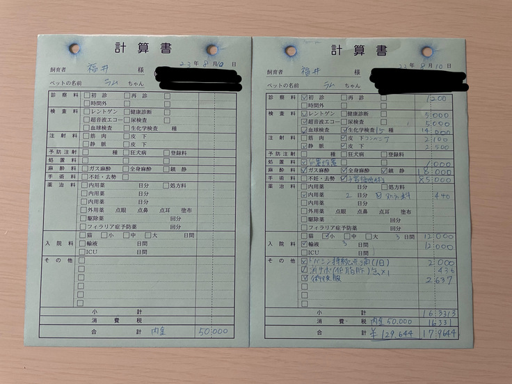 診察代、手術費、入院費等含め17万9644円かかりました。